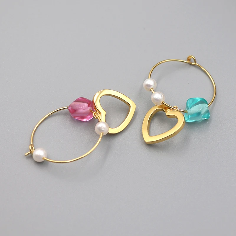 Sydänmuoto edustaa romanssia ja rakkautta, ja se voidaan täydellisesti yhdistää messingin retro -tunteeseen. Helmien ja hartsihelmien lisääminen lisää ainutlaatuisen ja tähden viehätysvoiman tähän kultapinnoitettuun messinki -sydänpariin hartsihelmien korvakoruilla.